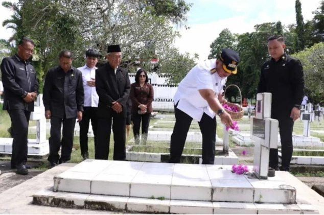 Bupati Robby Dondokambey memimpin penghormatan kepada arwah para pahlawan, kemudian meletakkan karangan bunga dan tabur bunga di pusara kedua almarhum.