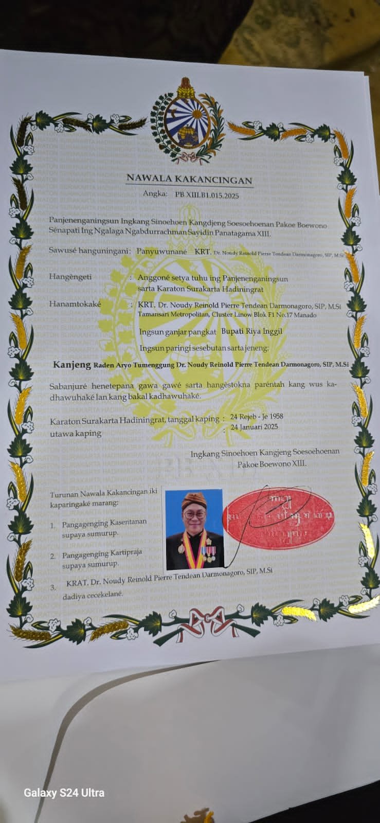 Solo XPOST.CO.ID – Penjabat Bupati Minahasa, Dr. Noudy R. P. Tendean, S.IP, M.Si, menerima gelar adat kehormatan dari Karaton Surakarta Hadiningrat Solo dalam acara Peringatan Syukuran Hari Besar Tahta Raja Karaton Solo Tingalan Dalem Jumenengan ke-21 SISKS Pakoe Boewono XIII pada Jumat (24/1/2025). Acara tersebut digelar di kompleks Karaton Surakarta dengan suasana khidmat dan penuh makna budaya.